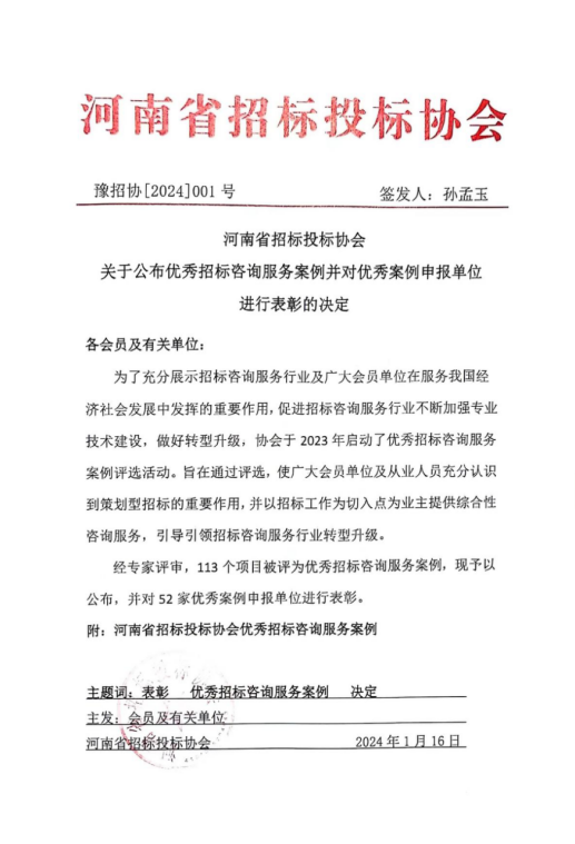 ?? ? 1 月 16 日,河南省招標(biāo)投標(biāo)協(xié)會(huì)公布了優(yōu)秀招標(biāo)咨詢服務(wù)案例并對(duì)優(yōu)秀案例申報(bào)單位進(jìn)行表彰。河南豫信招標(biāo)有限責(zé)任公司申報(bào)的開封綜合報(bào)稅區(qū)建設(shè)項(xiàng)目全過程工程咨詢、鄭州中滎城市更新有限公司滎陽(yáng)市 “ 鄭上文脈活力帶 ” 城市更新項(xiàng)目鄭上路道路改造提升及 15 分鐘生活圈工程、信陽(yáng)市出山店供水工程項(xiàng)目 EPC 總承包、河南林州弓上抽水蓄能電站施工供水工程項(xiàng)目、河南省大數(shù)據(jù)管理局一體化協(xié)同辦公平臺(tái)項(xiàng)目,被評(píng)為優(yōu)秀招標(biāo)咨詢服務(wù)案例。