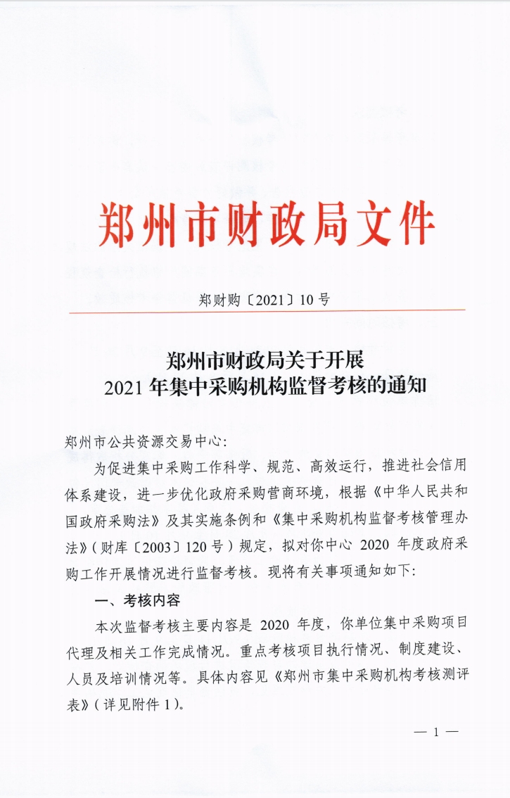 鄭州市財(cái)政局 關(guān)于開(kāi)展2021年集中采購(gòu)機(jī)構(gòu)監(jiān)督考核的通知