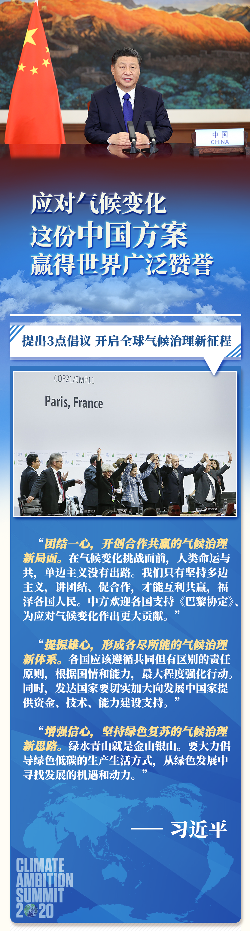 新華社北京12月13日電 12月12日,習(xí)近平主席在氣候雄心峰會(huì)上通過(guò)視頻發(fā)表題為《繼往開(kāi)來(lái),開(kāi)啟全球應(yīng)對(duì)氣候變化新征程》的重要講話,闡釋?xiě)?yīng)對(duì)氣候變化的中國(guó)主張,宣布中國(guó)國(guó)家自主貢獻(xiàn)最新舉措。