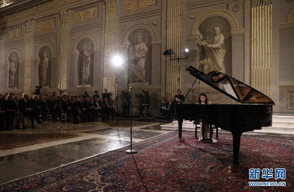 2020年2月13日,在意大利羅馬總統(tǒng)府奎里納萊宮,旅意華人鋼琴家居覲在音樂會現(xiàn)場演奏。當日,由意大利總統(tǒng)馬塔雷拉提議,在2020年中意文化旅游年計劃外加演的一場鋼琴獨奏音樂會在意大利總統(tǒng)府舉行,向抗擊新冠肺炎疫情的中國人民傳達友誼和支持。新華社記者 程婷婷 攝