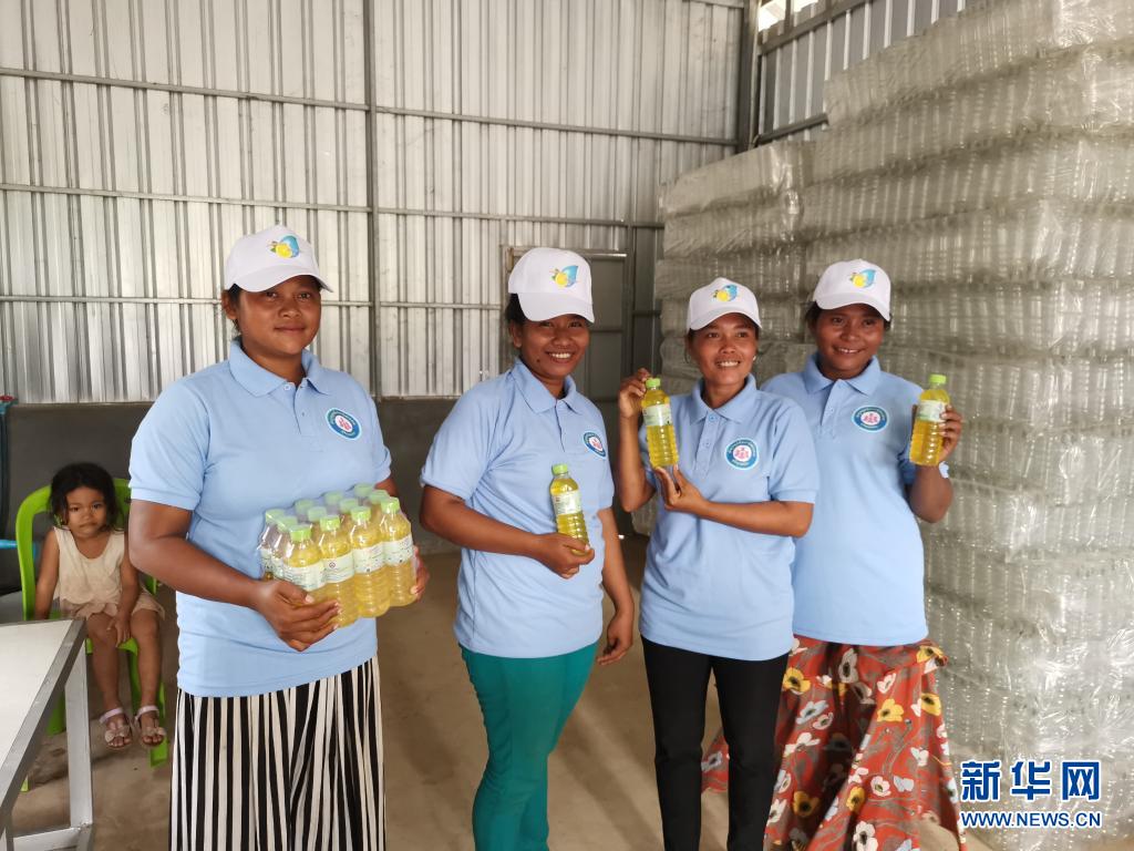 2020年7月31日,村民在柬埔寨干丹省莫穆坎普縣斯瓦安普鄉(xiāng)的洗潔精加工廠展示生產的洗潔精。新華社發(fā)