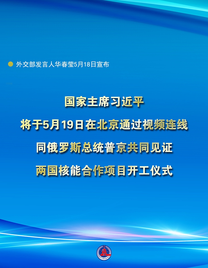 新華社北京5月18日電 外交部發(fā)言人華春瑩18日宣布:國(guó)家主席習(xí)近平將于5月19日在北京通過視頻連線,同俄羅斯總統(tǒng)普京共同見證兩國(guó)核能合作項(xiàng)目開工儀式。