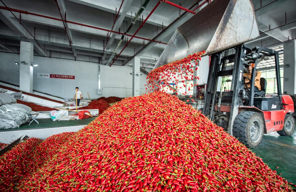 工人在遵義市新蒲新區(qū)一家辣椒加工企業(yè)內(nèi)轉(zhuǎn)運(yùn)辣椒(2020年8月13日攝)。新華社記者陶亮攝
