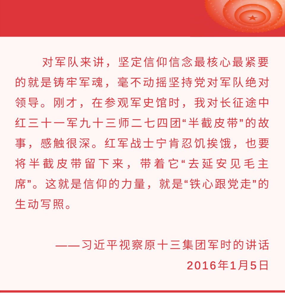 2016年1月5日,習(xí)主席視察原13集團軍,當(dāng)聽到“半截皮帶”的故事時,習(xí)主席深有感觸地說:“這就是信仰的力量,就是‘鐵心跟黨走’的生動寫照。”
