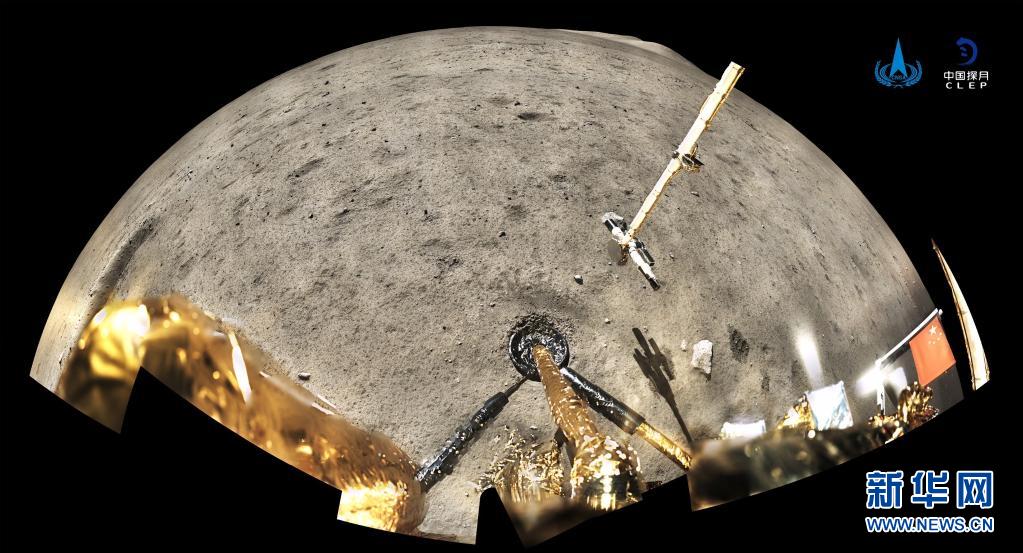 2020年12月4日,國(guó)家航天局公布了探月工程嫦娥五號(hào)探測(cè)器在月球表面國(guó)旗展示的照片。嫦娥五號(hào)著陸器和上升器組合體全景相機(jī)環(huán)拍成像,五星紅旗在月面成功展開,此外圖像上方可見已完成表取采樣的機(jī)械臂及采樣器。新華社發(fā)(國(guó)家航天局供圖)