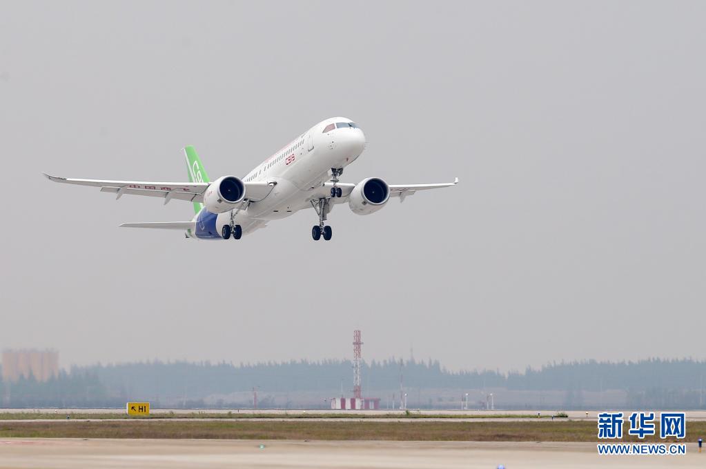 2017年5月5日,國(guó)產(chǎn)大型客機(jī)C919在上海浦東國(guó)際機(jī)場(chǎng)首飛成功。新華社記者 丁汀 攝
