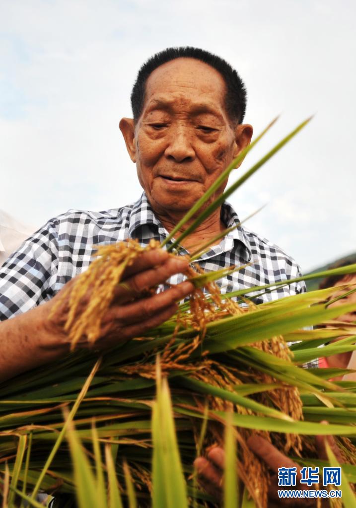 2013年8月19日,袁隆平院士在廣西桂林市灌陽(yáng)縣黃關(guān)鎮(zhèn)聯(lián)德村袁隆平超級(jí)稻第四期攻關(guān)示范片查看水稻生長(zhǎng)情況。新華社記者 陸波岸 攝