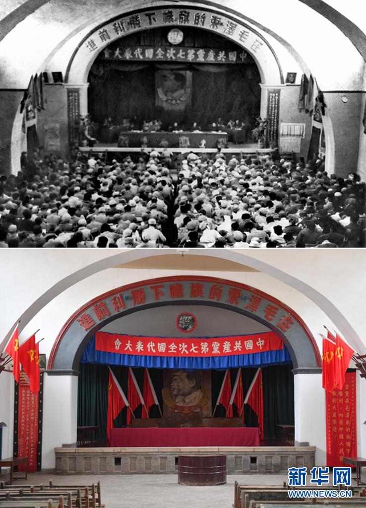 拼版照片:上圖為中國共產(chǎn)黨第七次全國代表大會會場(資料照片,新華社發(fā));下圖為2021331日拍攝的位于延安市楊家?guī)X革命舊址的中國共產(chǎn)黨第七次全國代表大會會場(新華社記者張博文攝)。新華社發(fā)