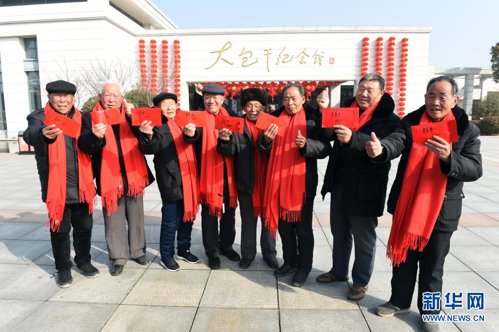 23日,在安徽省滁州市鳳陽縣小崗村,8大包干帶頭人在大包干紀(jì)念館前展示自家領(lǐng)取的集體經(jīng)濟(jì)收益股權(quán)分紅。新華社記者 周牧 攝