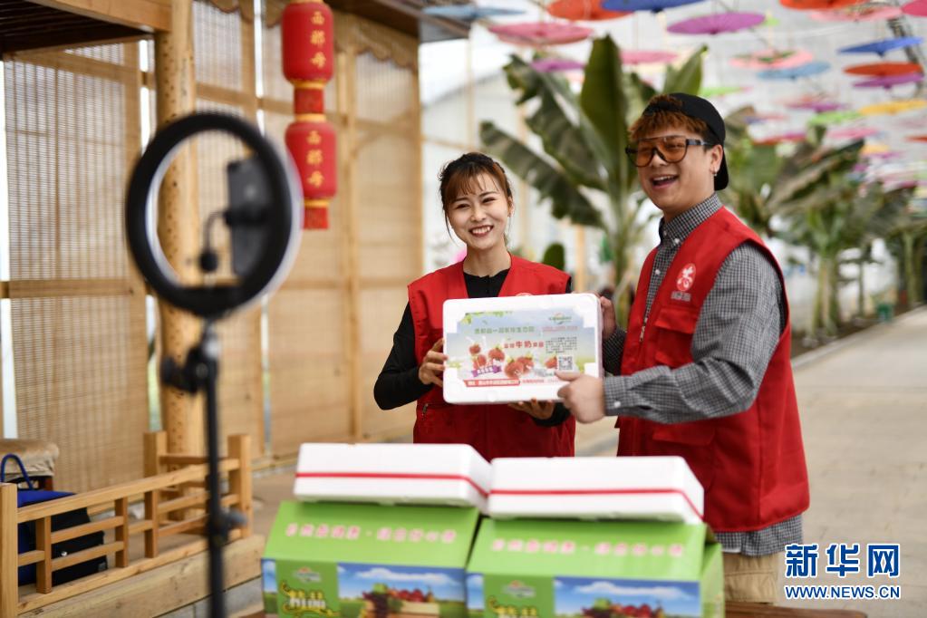 511日,工作人員在河北省唐山市豐潤區(qū)西那母生態(tài)旅游度假村內(nèi)通過網(wǎng)絡(luò)直播的形式推介草莓。新華社記者 牟宇 攝