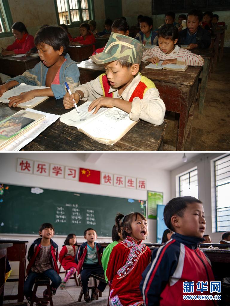 這是一張拼版照片。上圖:2003年6月13日,云南省瀾滄拉祜族自治縣木戛鄉(xiāng)哈卜嗎村小學(xué)的學(xué)生張扎妥(右)在教室上課(新華社記者 秦晴攝);下圖:2021年3月3日,張扎妥的女兒張娜妥(右二)在哈卜嗎村小學(xué)一年級的課堂上(新華社記者江文耀攝)。新華社發(fā)