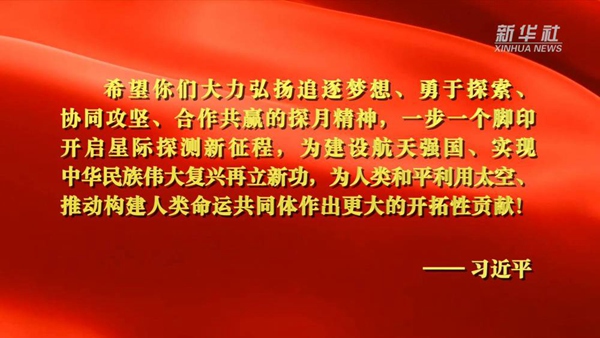 ?? 習(xí)近平總書記曾用“追逐夢想、勇于探索、協(xié)同攻堅(jiān)、合作共贏”這16個(gè)字高度概括總結(jié)了“探月精神”,勉勵(lì)航天工作者們一步一個(gè)腳印開啟星際探測新征程,為建設(shè)航天強(qiáng)國、實(shí)現(xiàn)中華民族偉大復(fù)興再立新功。