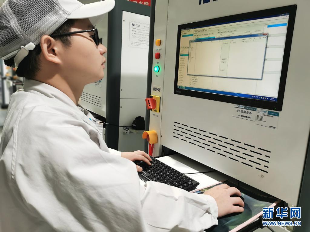 7月20日,在廣州廣汽埃安新能源汽車有限公司動(dòng)力電池車間,電池支持工程師周林在調(diào)試動(dòng)力電池檢測設(shè)備。新華社發(fā)