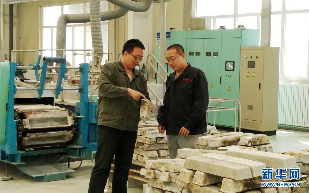 在內(nèi)蒙古包頭稀土研究院,科研人員胡文鑫(左)和同事分析合金斷面(資料照片)。新華社發(fā)