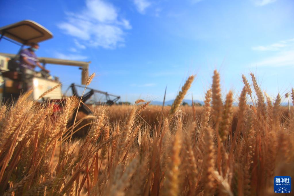 收割機(jī)在山東省臨沂市平邑縣的麥田里收割小麥(6月8日攝)。新華社發(fā)(武紀(jì)全 攝)
