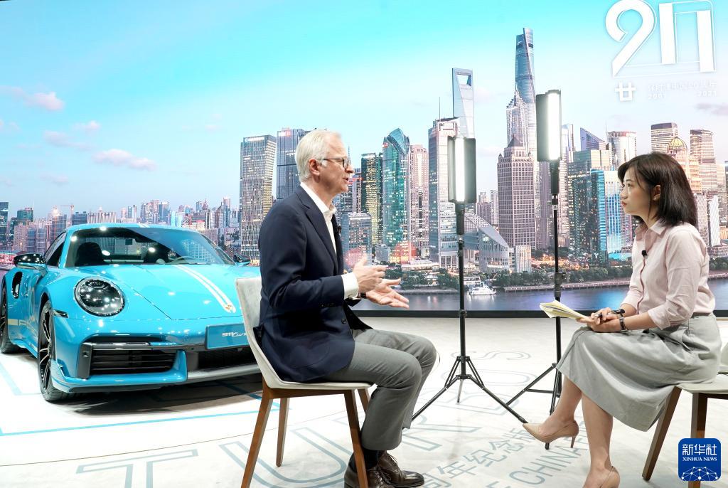 4月19日,保時(shí)捷高管在第十九屆上海國(guó)際汽車(chē)工業(yè)展覽會(huì)上接受采訪。新華社記者 陳建力 攝