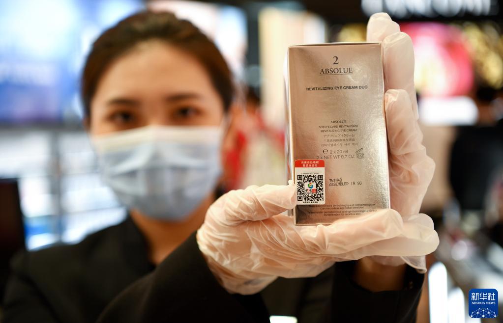 7月31日,??谌赵聫V場(chǎng)免稅店工作人員展示加貼溯源碼的商品。新華社記者 郭程 攝