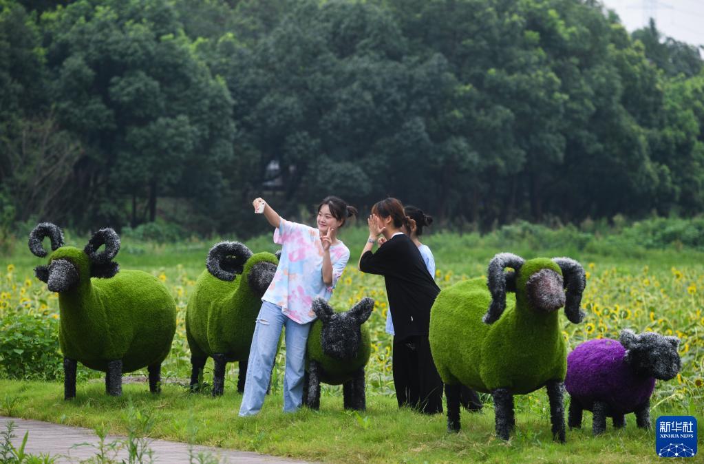 8月10日,幾名游客在浙江湖州東林鎮(zhèn)南山村特色度假小鎮(zhèn)的向日葵花田旁自拍留影。新華社記者 徐昱 攝