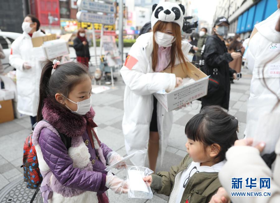 2月29日,在日本東京的池袋站前,在日華僑華人志愿者團(tuán)體“口罩熊貓行動小組”向當(dāng)?shù)孛癖娒赓M(fèi)發(fā)放口罩,一名小志愿者(左)將兒童用口罩送給日本小朋友。新華社記者 杜瀟逸 攝