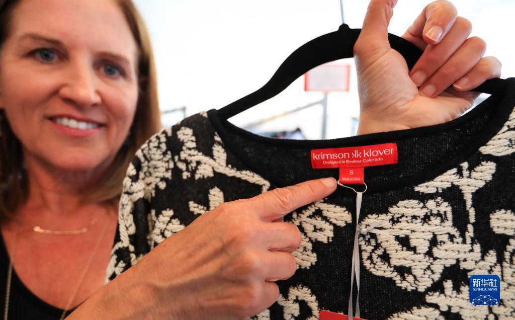 2019年9月12日,在美國科羅拉多州博爾德,克里姆森-克洛弗公司創(chuàng)始人兼首席執(zhí)行官朗達(dá)·斯溫森展示中國制造的衣服的標(biāo)簽。新華社記者 李穎 攝