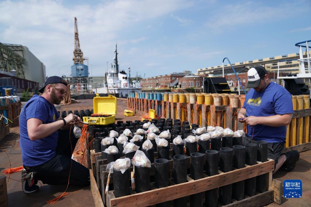 2019年5月25日,工作人員在美國賓夕法尼亞州費(fèi)城一處碼頭安裝產(chǎn)自中國湖南瀏陽的煙花,為當(dāng)晚美國陣亡將士紀(jì)念日的煙花表演做準(zhǔn)備。新華社記者 劉杰 攝