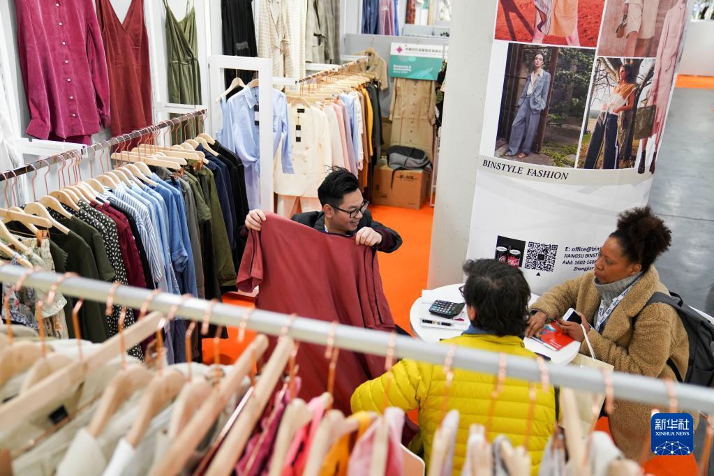 2020年1月21日,在美國紐約舉行的第二十一屆中國紡織品服裝貿(mào)易展覽會(huì)(紐約)春季展上,江蘇一家企業(yè)的工作人員(左)為訪客介紹產(chǎn)品。新華社記者 王迎 攝
