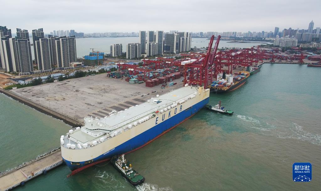 2020年2月16日,滾裝貨船“勞拉”輪駛?cè)牒?谛阌⒏郏o人機(jī)照片)。這是海南自貿(mào)區(qū)政策實(shí)施后的首艘汽車外貿(mào)船。新華社記者 楊冠宇 攝