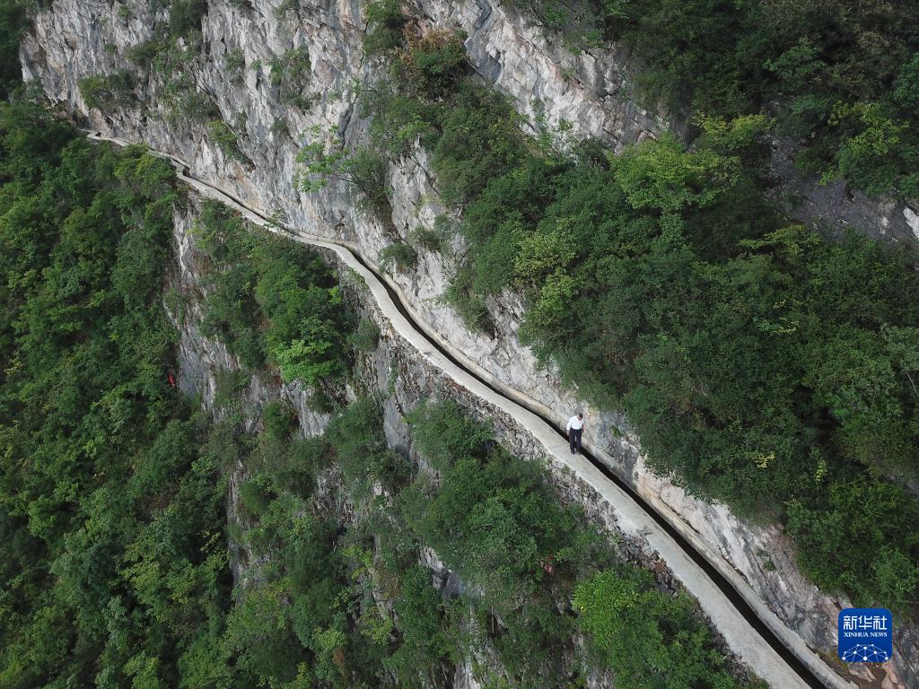 黃大發(fā)沿著修建在絕壁上的“大發(fā)渠”巡查(2018年8月11日攝,無(wú)人機(jī)照片)。新華社記者 劉續(xù) 攝