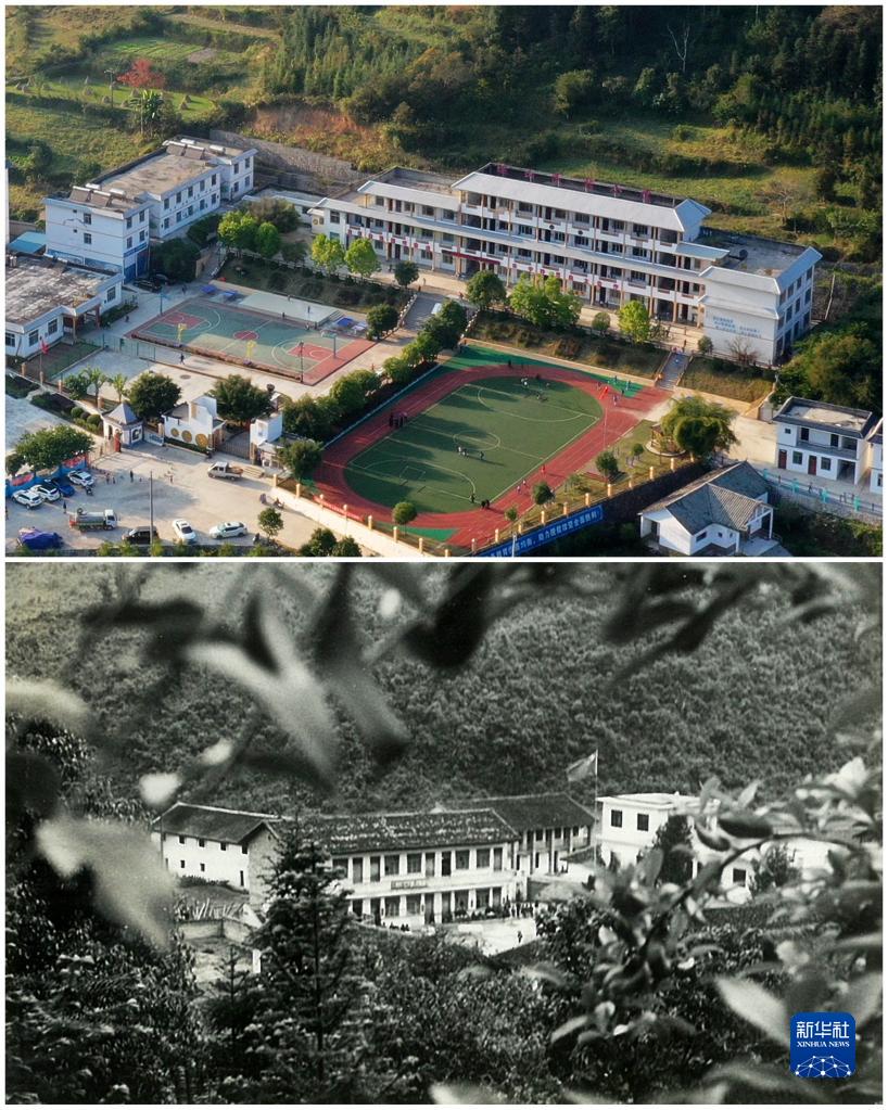 拼版照片:上圖為2019年11月5日拍攝的貴州省荔波縣瑤山民族小學(xué)新貌(無(wú)人機(jī)照片,新華社記者楊文斌攝);下圖為荔波縣瑤山民族小學(xué)舊貌(資料照片)。新華社發(fā)