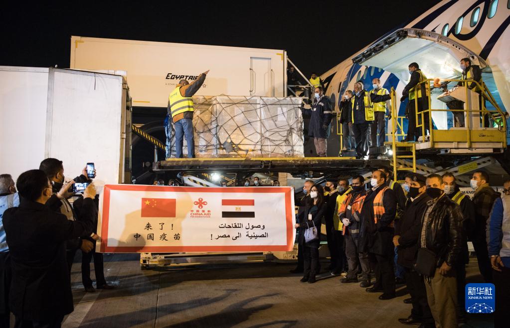 2月23日,在埃及開羅國際機場,工作人員運輸疫苗。中國援助埃及的首批新冠疫苗當(dāng)日凌晨運抵開羅,援助阿盟秘書處的新冠疫苗也同機抵達(dá)。新華社記者 鄔惠我 攝