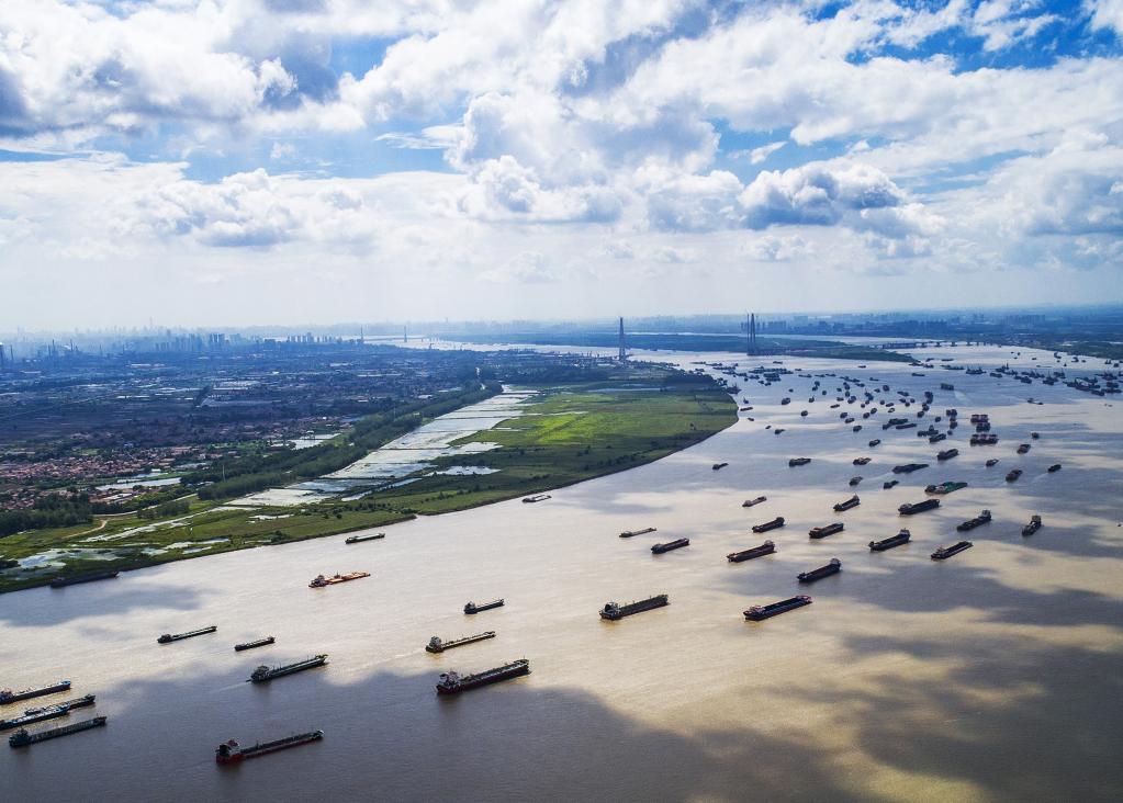 這是2018年8月13日通過無人機拍攝的船舶在湖北省武漢市陽邏港區(qū)水域行駛。(新華社記者肖藝九攝)