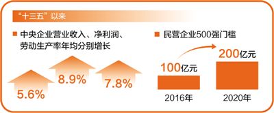 國企規(guī)模實(shí)力持續(xù)增強(qiáng),效益穩(wěn)步提高。預(yù)計(jì)到今年底,中央企業(yè)資產(chǎn)總額將接近69萬億元,比十二五末增長45%。十三五以來,中央企業(yè)營業(yè)收入、凈利潤、勞動生產(chǎn)率年均分別增長5.6%、8.9%7.8%,進(jìn)入世界500強(qiáng)的中央企業(yè)達(dá)到48家。民企改革發(fā)展成效顯著。十三五以來,民營企業(yè)500強(qiáng)門檻從2016年的100億元提升至2020年的200億元;創(chuàng)新創(chuàng)業(yè)創(chuàng)造熱情高漲,中小企業(yè)數(shù)量增長近1倍。