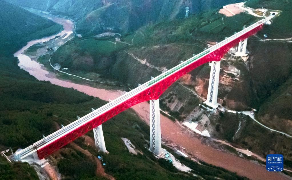 中老鐵路首發(fā)列車駛過中國云南省元江哈尼族彝族傣族自治縣境內(nèi)的元江雙線特大橋(12月3日攝,無人機(jī)照片)。新華社記者 王冠森 攝