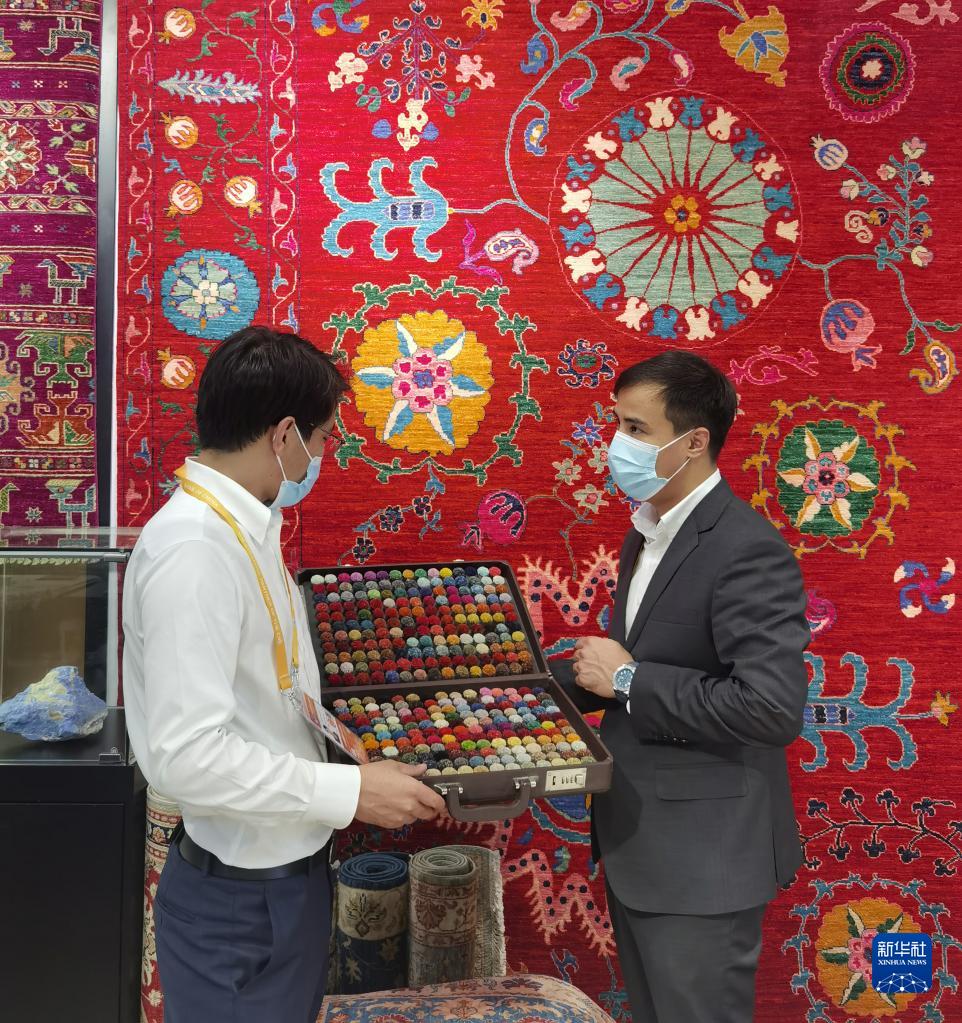 11月5日,阿富汗參展商阿里·法伊茲(右)在第四屆進(jìn)博會阿富汗手工羊毛地毯展臺忙碌。新華社記者 吳宇 攝