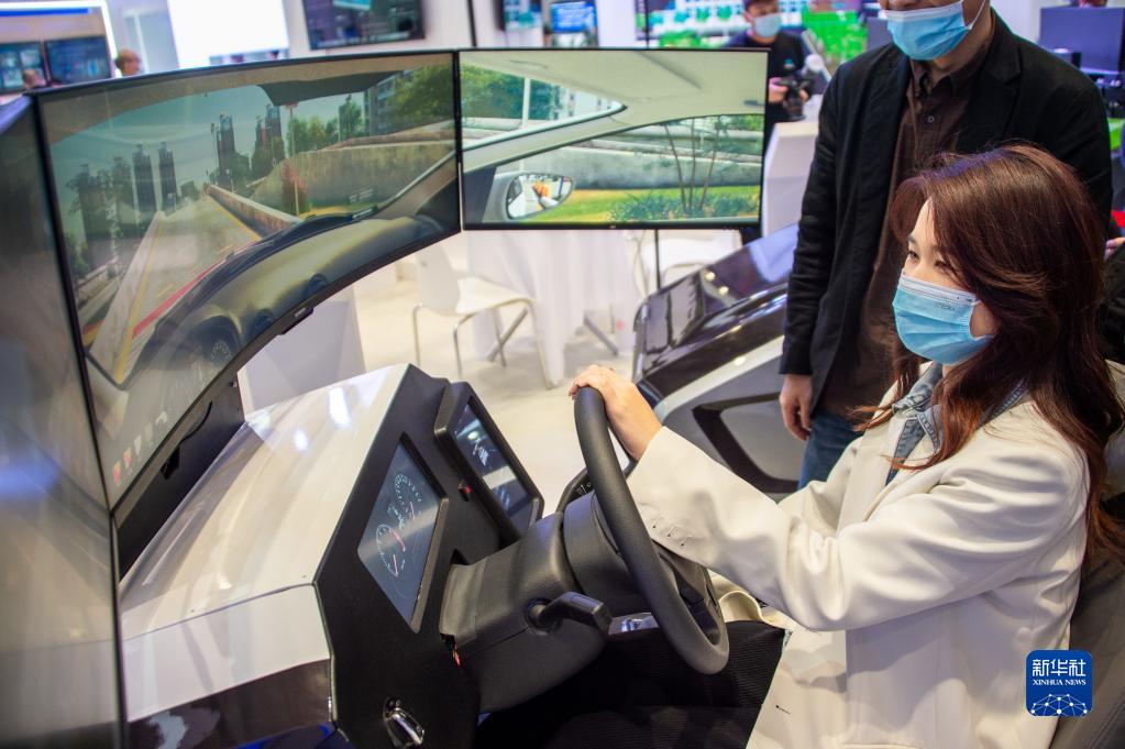 11月19日至21日,2021中國5G+工業(yè)互聯(lián)網(wǎng)大會在位于武漢的中國光谷科技會展中心舉行。這是 11月19日,參觀者在“5G+工業(yè)互聯(lián)網(wǎng)成果展”上體驗駕駛智能模擬器。新華社發(fā)(伍志尊 攝)