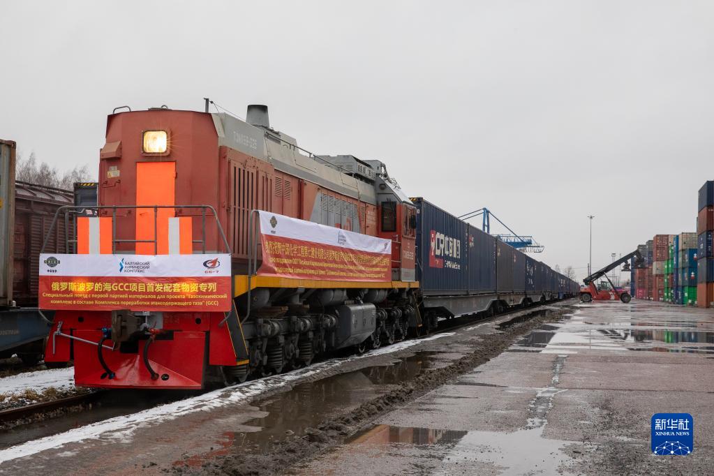 2021年3月15日,由中國成都首發(fā)至俄羅斯圣彼得堡市的中歐班列抵達(dá)俄羅斯圣彼得堡舒沙雷火車站。新華社發(fā)(俄羅斯鐵路公司十月鐵路局供圖)