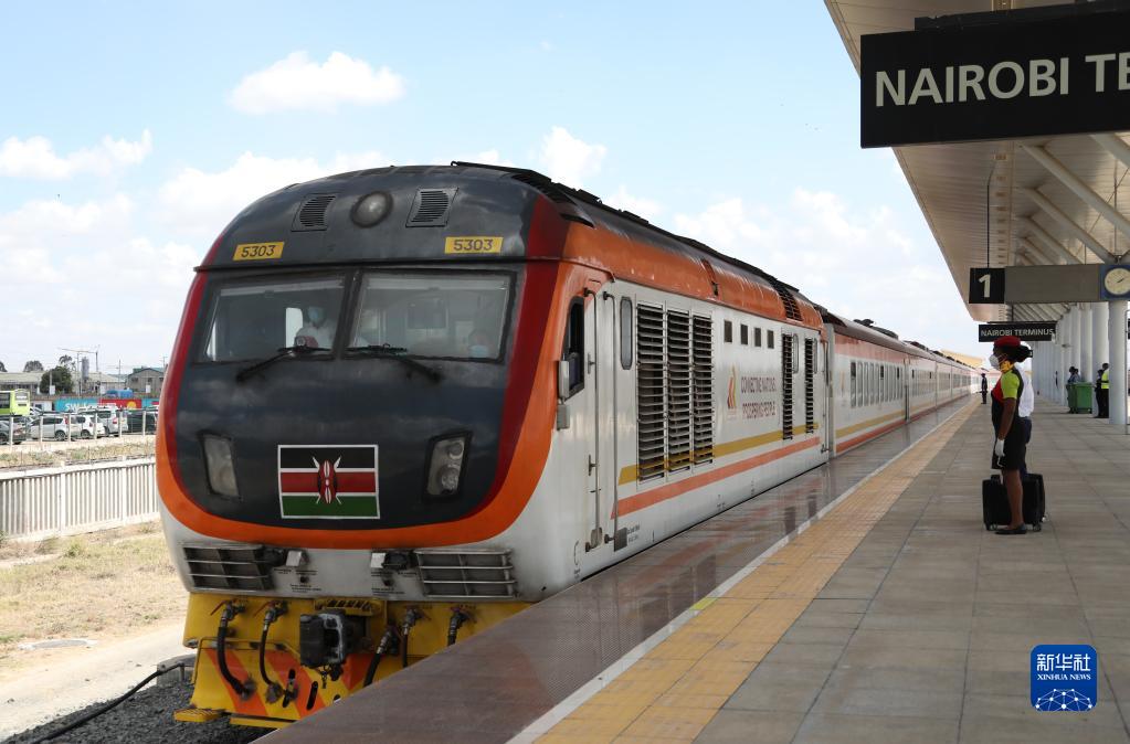 2021年11月17日,由蒙巴薩始發(fā)的蒙內(nèi)鐵路客運(yùn)列車駛?cè)肟夏醽唭?nèi)羅畢站。蒙內(nèi)鐵路連接?xùn)|非第一大港口蒙巴薩和肯首都內(nèi)羅畢,于2017年5月31日開通。新華社記者 董江輝 攝