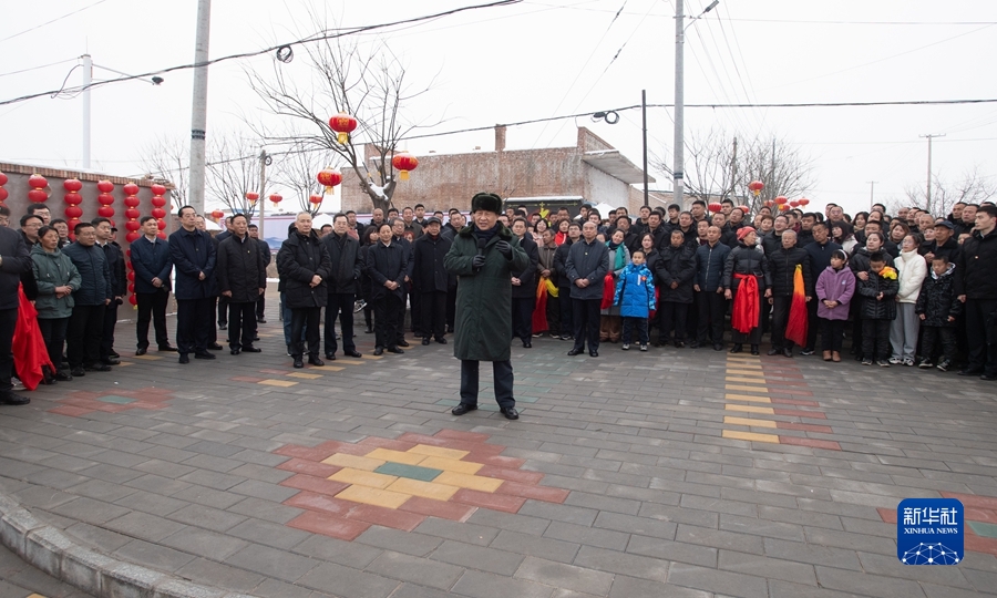 村文化廣場(chǎng)上十分熱鬧,村民們打起威風(fēng)鑼鼓、扭起秧歌歡慶佳節(jié)??吹娇倳泚砹?,人們高興地歡呼起來。習(xí)近平對(duì)鄉(xiāng)親們說,我們黨的根本宗旨就是為人民群眾辦好事,為人民群眾幸福生活拼搏、奉獻(xiàn)、服務(wù)。我們?nèi)缙诖蜈A了脫貧攻堅(jiān)戰(zhàn),如期實(shí)現(xiàn)了全面建成小康社會(huì)目標(biāo),現(xiàn)在踏上了全面建設(shè)社會(huì)主義現(xiàn)代化國(guó)家新征程。建設(shè)現(xiàn)代化國(guó)家離不開農(nóng)業(yè)農(nóng)村現(xiàn)代化,要繼續(xù)鞏固脫貧攻堅(jiān)成果,扎實(shí)推進(jìn)鄉(xiāng)村振興,讓群眾生活更上一層樓,在推進(jìn)農(nóng)業(yè)農(nóng)村現(xiàn)代化中越走越有奔頭。