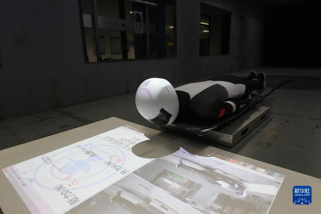 在北京交通大學(xué)風(fēng)洞實(shí)驗(yàn)室,風(fēng)洞輔助訓(xùn)練系統(tǒng)顯示的信息將運(yùn)動速度、運(yùn)動風(fēng)阻力、運(yùn)動姿態(tài)及測試指令實(shí)時(shí)反饋給測試人員(2021年7月16日攝)。新華社記者 任超 攝