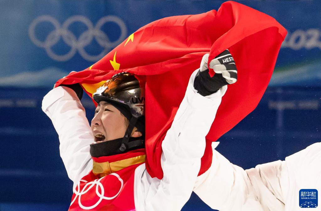 2月14日,中國(guó)選手徐夢(mèng)桃在比賽后慶祝。當(dāng)日,北京2022年冬奧會(huì)自由式滑雪女子空中技巧決賽在張家口云頂滑雪公園舉行,中國(guó)選手徐夢(mèng)桃?jiàn)Z得冠軍。新華社記者 肖藝九 攝