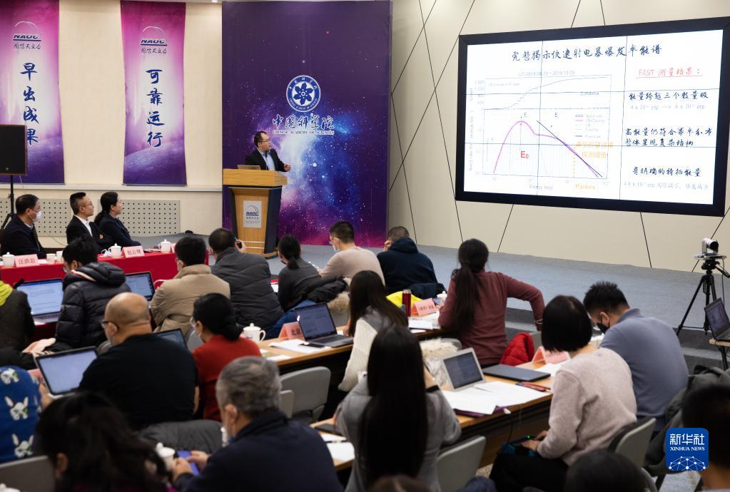 1月5日,在中科院國家天文臺舉行的新聞發(fā)布會上,國家天文臺王培在介紹FAST在快速射電暴領域的重大成果。新華社記者 金立旺 攝
