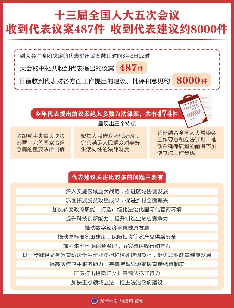據(jù)了解,經(jīng)梳理分析,今年代表提出的議案絕大多數(shù)為法律案,共有474件,呈現(xiàn)出三個(gè)特點(diǎn)。一是緊跟黨中央重大決策部署,完善國(guó)家治理急需的重要法律制度。代表們提出了制定突發(fā)公共衛(wèi)生事件應(yīng)對(duì)法、糧食安全保障法、能源法以及碳達(dá)峰碳中和、數(shù)字經(jīng)濟(jì)、大數(shù)據(jù)、社會(huì)信用等方面法律的議案。二是聚焦人民群眾所思所盼,完善滿足人民群眾對(duì)美好生活向往的法律制度。代表們提出了制定學(xué)前教育法、社會(huì)救助法、反電信網(wǎng)絡(luò)詐騙法以及托育服務(wù)、養(yǎng)老服務(wù)等方面法律,修改職業(yè)教育法、婦女權(quán)益保障法等法律的議案,以法治方式推動(dòng)解決人民群眾反映較多的民生領(lǐng)域突出問(wèn)題。三是緊密結(jié)合全國(guó)人大常委會(huì)工作要點(diǎn)和立法計(jì)劃,推動(dòng)在確保質(zhì)量的前提下加快立法工作步伐。代表們提出了制定農(nóng)村集體經(jīng)濟(jì)組織法、民事強(qiáng)制執(zhí)行法、黑土地保護(hù)法,修改公司法、反壟斷法、企業(yè)破產(chǎn)法、治安管理處罰法等法律的議案,這些立法項(xiàng)目都已納入了今年常委會(huì)的重點(diǎn)工作安排。此外,代表們還提出了修改刑法、啟動(dòng)條件成熟領(lǐng)域法典編纂的議案。