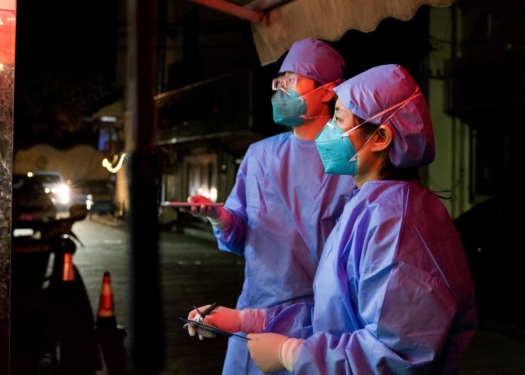 3月16日晚,流調(diào)人員在進(jìn)行軌跡排查。新華社記者劉穎攝
