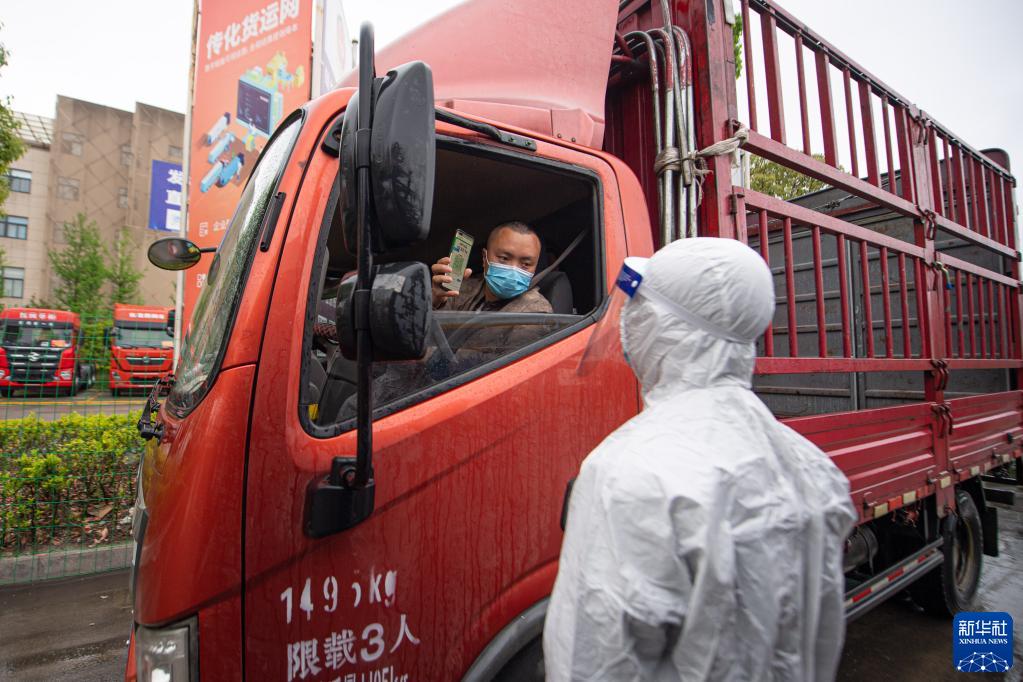 4月13日,工作人員查驗(yàn)駛?cè)牒贾輦骰犯鄣呢涇囁緳C(jī)健康碼。新華社記者 江漢 攝