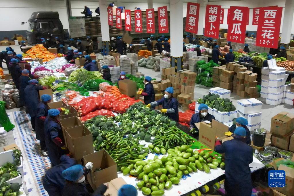 吉林省梅河口市工作人員進行“蔬菜包”菜品分揀(4月7日攝,無人機照片)。新華社發(fā)