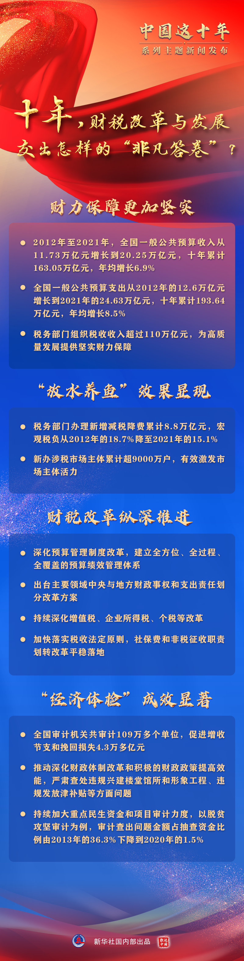 深化預(yù)算管理制度改革,建立全方位、全過程、全覆蓋的預(yù)算績效管理體系;出臺主要領(lǐng)域中央與地方財政事權(quán)和支出責(zé)任劃分改革方案;持續(xù)深化增值稅和企業(yè)所得稅改革,初步建立綜合與分類相結(jié)合的個人所得稅制度;強化財會監(jiān)督,嚴(yán)格財經(jīng)紀(jì)律……十年來,財稅體制改革縱深推進。