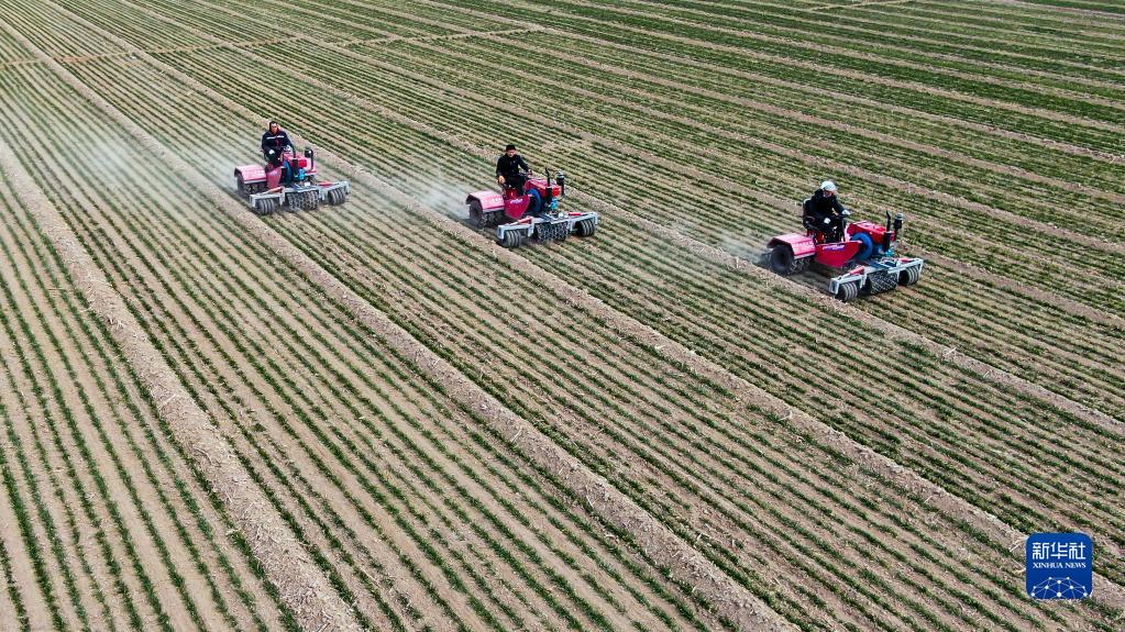 2月17日,在山東省聊城市莘縣妹冢鎮(zhèn),農(nóng)民在麥田里進(jìn)行鎮(zhèn)壓保墑作業(yè)(無人機照片)。新華社記者 郭緒雷 攝