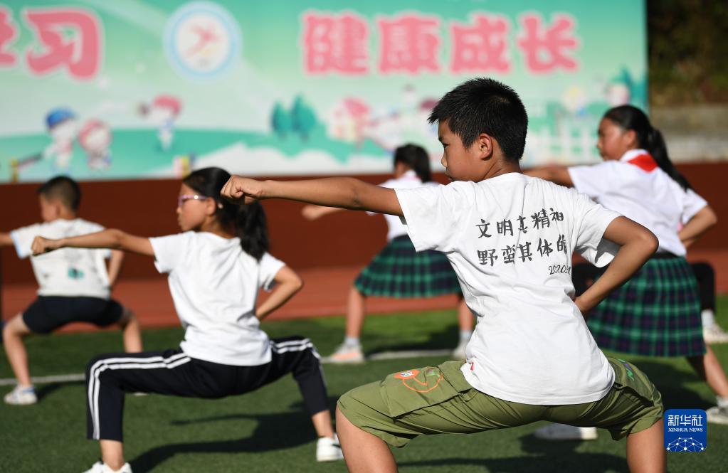 在陜西省安康市平利縣老縣鎮(zhèn)中心小學的操場上,學生們在課后參加武術社團活動(2020年9月7日攝)。新華社記者 李一博 攝