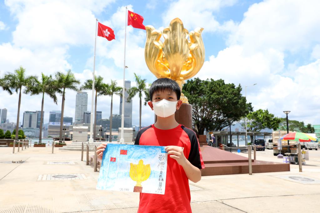 香港小學(xué)生曾祥珂帶著自己的畫作《敬禮——慶祝香港回歸25周年》,在父母陪伴下來到金紫荊廣場留影,迎接香港回歸25周年。新華社記者 吳曉初 攝