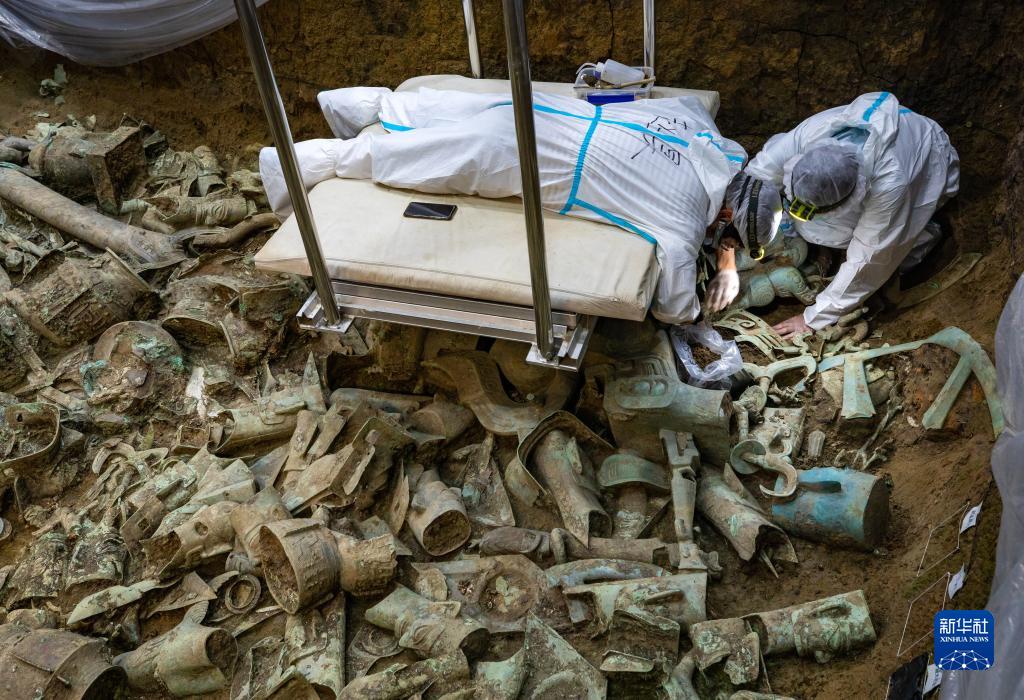 這是在三星堆遺址8號“祭祀坑”拍攝的銅神獸(6月1日攝)。新華社記者 王曦 攝